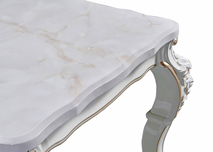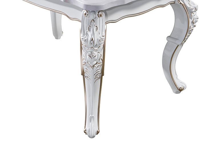 Es gibt vorzügliche geschnitzte Muster auf den Seiten und den Beinen des Speisetisches. Die Beine des Europäisch-ähnlichen Speisetisches einen typischen Spaltenentwurf verwenden, der das typischste Repräsentativelement der europäischen Art ist. Der Gesamtspeisetisch ist luxuriös und romantisch, und der Gesamtbogen des Speisetisches ist schön und gibt uns einen schönen Genuss. Ich erfahre die Anmut und den Luxus, wenn ich die Nahrung mit meiner Familie schmecke.